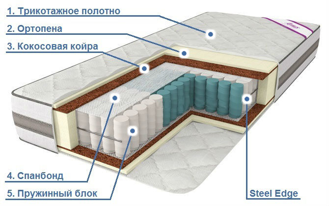 4. Спанбонд. Дополнительный слой из нетканого материала находится между блоком пружин и каркасом из кокосового волокна. Отвечает за дополнительный комфорт во время сна.