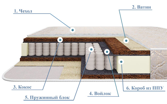 - Короб из ППУ. Чтобы матрас прослужил долго и сохранил свой первоначальный вид, края матраса усилены бортами из специального вспененного пенополиуретана. Он прочный, упругий и легкий, поэтому хорошо выдерживает весовые нагрузки.