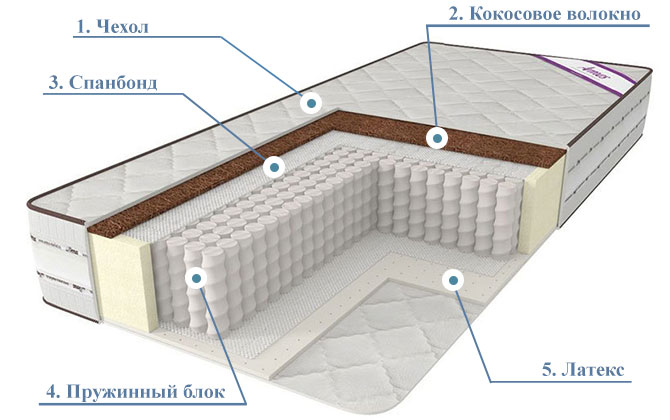 - Кокосовое волокно (1 см). Природный экологически безопасный материал. Он очень плотный, прочный и в то же время эластичный, в связи с этим обладает хорошими ортопедическими характеристиками. Поддерживает здоровый микроклимат спального места — обладает высокой воздухопроводностью, способствует нормальной терморегуляции и не впитывает воду.